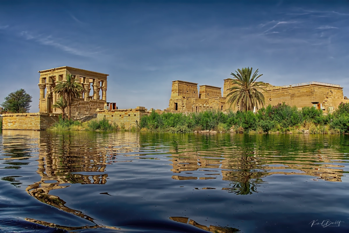 L’objectif révèle toute la magie du Temple de Philae : il semble flotter entre ciel et eau. Depuis le Nil, son reflet parfait à la surface du fleuve lui confère une aura presque irréelle, comme suspendu hors du temps. Sauvé des eaux après son démantèlement et sa reconstruction sur l’île d’Agilkia, il se dresse aujourd’hui dans toute sa splendeur. La lumière dorée du soleil glisse sur la pierre antique, sublimant les reliefs délicatement sculptés des colonnes et contrastant avec la végétation luxuriante qui l’enveloppe. Un équilibre saisissant entre la majesté du passé et la douceur d’un paysage préservé.