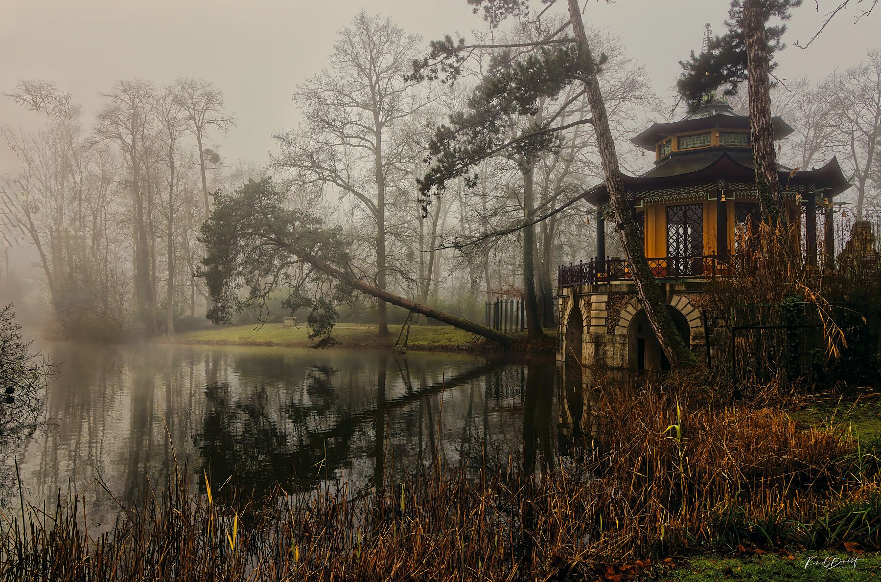 Cette photographie capture l’atmosphère envoûtante du Pavillon Chinois de L’Isle-Adam, baigné dans une brume matinale qui semble effacer la frontière entre rêve et réalité. L’eau calme du lac reflète les silhouettes des arbres dénudés, tandis que la structure orientale se dresse, solitaire et intemporelle. L’équilibre fragile entre nature et architecture confère à cette scène une profondeur singulière, où la lumière tamisée accentue le caractère énigmatique du lieu.
