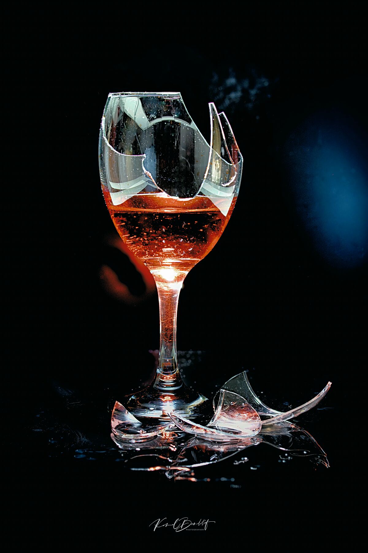 C’est la vision d’un équilibre rompu entre finesse et destruction. La lumière se fraie un chemin à travers les éclats, révélant des reflets subtils et des détails presque invisibles à l’œil nu. Le liquide encore présent dans le verre contraste avec les morceaux au sol, créant une tension entre l’instant figé et l’inévitable fragilité des objets du quotidien.